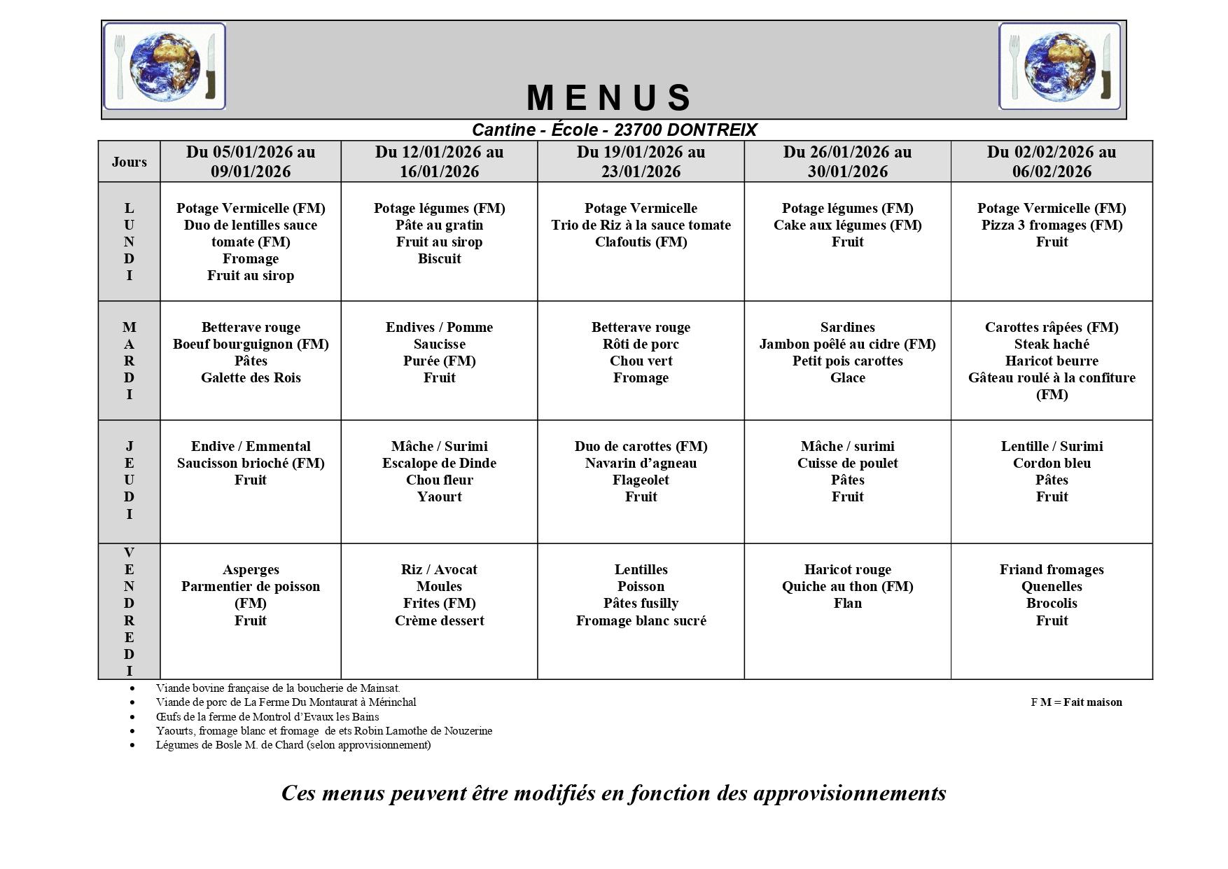 Menus de la cantine